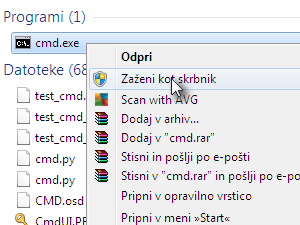 Sedaj z desnim miškinim gumbom kliknemo na cmd.exe in izberemo Zaženi kot skrbnik.