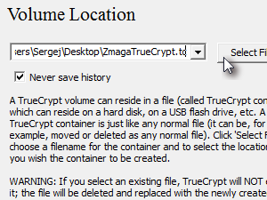 Sedaj kliknemo na gumb Select File in ustvarimo neko novo datoteko na poljubni lokaciji na disku, v kateri se bodo nahajali šifrirani podatki.