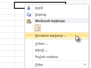 ![]() Če želimo več kontrole, lahko na mestu, kamor želimo kopirati celico, kliknemo desni miškin gumb in izberemo opcijo Posebno lepljenje. |