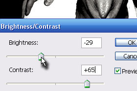 Drsnik za določanje Brightness premaknite bolj na levo, drsnik za Contrast pa bolj na desno stran. Jaz sem nastavil Brightness -29 in Contrast +65, ker želim da črna barva za malenkost nadvladuje belo barvo. Potrdite spremembe na gumb OK. |