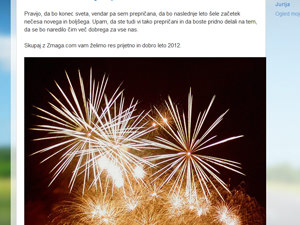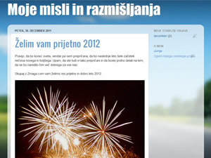 ![]() ... in slika bi morala biti postavljena skoraj do roba dela strani, kjer se prikazujejo članki s slikami. Če je slika še vedno preširoka ali preozka, ponovite zadnje korake in uspelo vam bo v nekaj sekundah. Želimo vam poučno in prijetno leto 2012. Kliknite tukaj, da si še ogledate naš primer spletnega dnevnika s čestitko. Kliknite tukaj, da si pogledate šesti del vodiča, kjer bomo nastavili regionalne nastavitve in dodali poljubno spletno ikono.