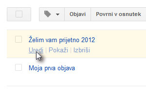 ![]() Objavite kak nov članek ali pa odprite obstoječega tako, da se z miško premaknete nad njim in nato kliknete na Uredi. |