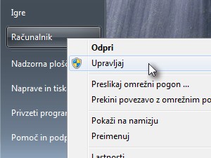 To najlažje storimo tako, da kliknemo na Start gumb in z desnim miškinim gumbom kliknemo na Računalnik in izberemo možnost Upravljaj oz. v Windows 10 s klikom na Upravljanje diskov.