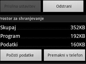 ![]() Kot vidimo se je skoraj celotna aplikacija uspešno prenesla na SD kartico, saj sedaj zaseda samo še 352KB internega pomnilnika na telefonu. Tako smo na enostaven način pridobili več kot 12 MB prostora za nameščanje novih aplikacij.