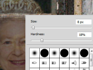 ![]() Kliknite z desnim miškinim gumbom na dokument in izberite poljubno velik Size (velikost radirke) in Hardness na okoli 18% (glej sliko). |