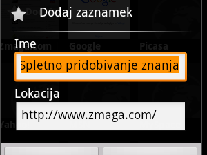 Kliknemo levo ikono, kjer piše Dodaj, da spletno stran zmaga.com dodamo med zaznamke.