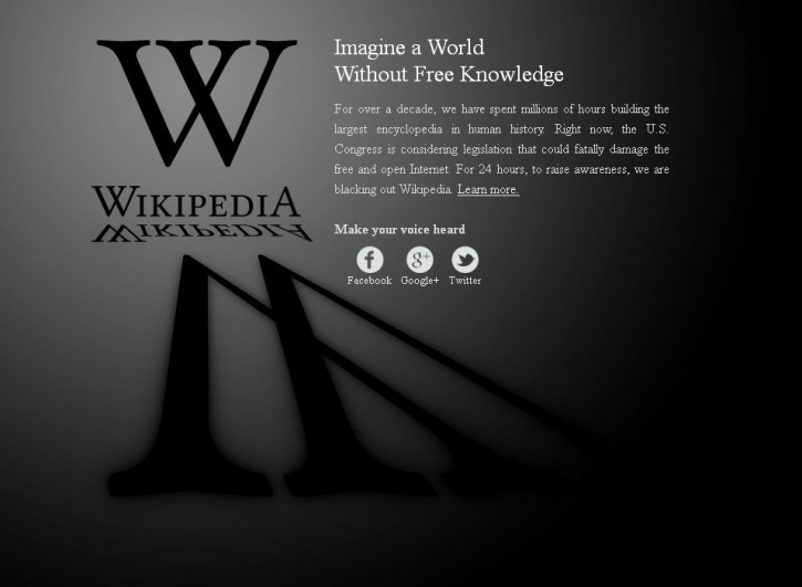 | Šesta najbolj obiskana spletna stran na svetu, ki jo dnevno obišče 25 milijonov ljudi, je danes nedostopna, saj na Wikipedii nasprotujejo osnutkoma nove protipiratske zakonodaje, o katerih odloča ameriški kongres. Prav tako se je protestu pridružil Google, ki je danes svoj zgornji trak s spletnimi storitvami prebarval v črno. Poleg Google sta se oglasila tudi Yahoo in Twitter, saj vsi skupaj menijo, da novi poseg v zakon ogroža svobod govora in bi z njim imela vlada moč cenzure, kot jo poznamo na Kitajskem. Sporna zakonodaja SOPA (Stop Online Piracy Act) med drugim omogoča blokiranje spletnih strani zgolj na podlagi obtožbe, da kršijo avtorske pravice in jo podpirata ameriška glasbena in filmska industrija. Sprva je imel tudi Google namen onemogočiti svoje storitve, vendar naj bi se v zadnjem trenutku premislil.