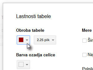 V novem oknu v polju Obroba tabele nastavite barvo in tudi širino obrobe.