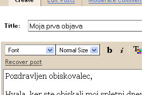 Jaz sem vpisal Moja prva objava. Spodaj pa vpišite tekst. Tukaj sem napisal dobrodošlico in nekaj stavkov o meni. |