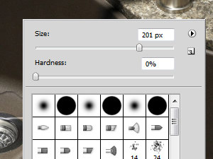 Kliknite z desnim miškinim gumbom na dokument in določite malo večji velik čopič (Size) in Hardness 0% (glej sliko).