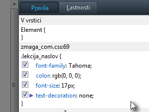 ![]() Dobrodošla stvar pa je tudi Slog. Če izberemo poljuben element, za ta element dobimo podroben opis vseh njegovih CSS lastnosti.
