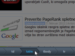 ![]() Na dnu brskalnika lahko tudi vidite, kako je izbrani element vpet v ostale HTML elemente na strani. |