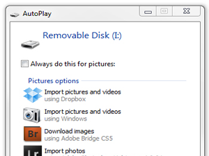 ![]() Beta različica Windows vam ponuja možnost nalaganja video in slikovne vsebine iz zunanjih medijev. Vstavite pomnilniško kartico ali usb ključ s slikami ali videi (brez drugih map in datotek) v računalnik. Pojavilo se vam bo okno s Samodejnim predvajanjem, kot prikazuje slika na levi. Kliknite "Import Pictures and Videos". Sedaj bo Dropbox aplikacija naložila vse najdene slike v vaš spletni prostor. Za vsakih 500MB naloženih slik ali videov, boste dobili 500MB več prostora! (Slike in videe lahko potem izbrišete!)
