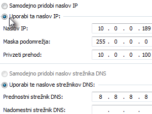 Sedaj izberemo možnost Uporabi ta naslov IP ter možnost Uporabi te naslove strežnikov DNS in ročno vpišemo lastne nastavitve.