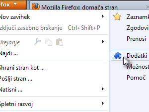 Desno zgoraj kliknemo gumb Firefox in izberemo opcijo Dodatki.