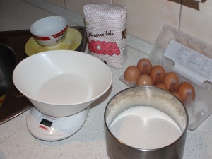 Najprej si pripravimo 8 dag moke, 6 dag sladkorja in 3 jajca za biskvitno testo. |