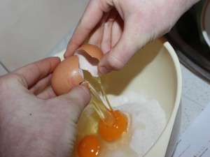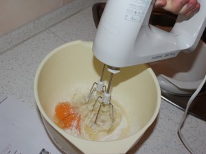 Sladkor, moko in pa 2 jajca damo v manjšo plastično posodo, tretje jajce pa ločimo rumenjak od beljaka. Beljak damo v posodo z ostalimi sestavinami, rumenjak pa shranimo za uporabo pri kakem drugem receptu. Dajte ga v kako večjo posodo, saj bo kasneje dobil družbo še osmih rumenjakov ;) |