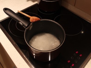 Za beljakovo maso 18 dag sladkorja kuhamo v 4 žlicah vode tako dolgo, da se zgosti. Pri tem maso redno mešamo.