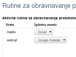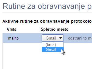 Na tej strani preverite ali v polju Aktivne rutine za obravnavanje protokolov že imate vnos za povezave mailto in če imate kakšno že nastavljeno.