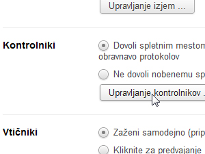 Zatem se prepričajte, da imate v razdelku Kontrolniki, označeno opcijo Dovoli spletnim mestom, da zahtevajo, da postanejo privzete rutine za obravnavo protokolov ter kliknite na gumb Upravljanje kontrolnikov ...