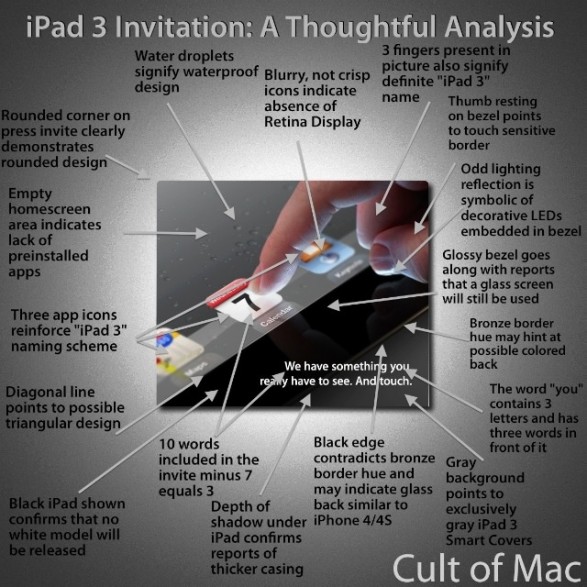 | Sedaj je tudi uradno, da iPad 3 izide 7. marca. Pričakovati gre ne malo novosti. iPad 3 naj bi poganjal močnejši procesor, povečana pa naj bi bila tudi količina RAM pomnilnika. Vsi upamo tudi na Applov visokoločljivostni ekran poimenovan "retina display". Za obe kameri pa je posodobitev precej samoumevna, saj je trenutna ločljivost res slaba in posledično prinaša slabšo uporabniško izkušnjo pri Facetime-u. Pričakujte tudi izid novega OS, kar bi posledično omogočilo poganjanje virtualne asistentke Siri tudi na iPadu. Je pa sicer vprašanje, koliko bi bilo to res uporabno, glede na to, da večina ljudi iPad-a ne nosi s seboj. Nekateri pa so šli še dalje in si upali napovedati ukinitev "home" gumba. Na opomniku sicer ni moč opaziti znanega gumbka vendar obstaja verjetnost, da je bil iPad pri fotografiranju postavljen v ležeči način. Nekoliko pa naj bi bil spremenjen tudi design. Pridobil naj bi nekaj milimetrov v debelino predvsem zaradi povečane kapacitete baterije, ki bo to "zver" oskrbovala s potrebno energijo.