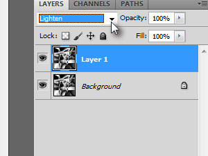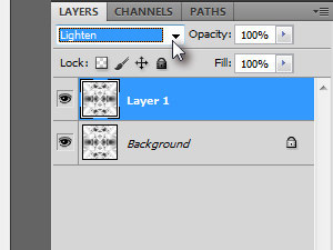 Kliknite nato zgoraj na Edit, Transform in izberite Rotate 90 CW. Layerju določite senčenje na Lighten (glej sliko). |