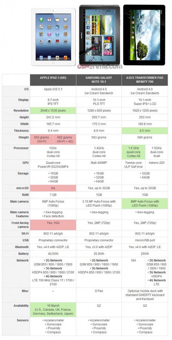 | Med novostmi najbolj izstopa izboljšana kvaliteta zaslona, saj tokratna verzija prinaša uporabo zaslona z ločljivostjo 2048x1536 oz. 264 točk na palec. Uporabljeni procesor A5x je nadgradnja verzije iz iPad2, pri čemer so dodali dodatni dve jedri za grafično pospeševanje, kar je potrebno za tekoče delovanje zaslona pri tej ločljivosti, med drugim pa omogoča tudi predvajanje vsebin v polni HD 1080p ločljivosti. Poleg tega nova verzija iPada vključuje tudi podporo za 4G LTE povezljivost, ki bo omogočala hitrejšo povezljivost za prenos podatkov, prav tako pa so dvignili tudi ločljivost vgrajene kamere na 5 megapikslov. Uradni datum izida bo 16. marec 2012, cena pa naj bi se gibala od 499$ za verzijo WiFi do $829 za verzijo s 64GB prostora in 4G povezljivostjo.