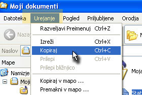 Ko imamo datoteke (in mape) označene, kliknemo na Urejanje in izberemo Kopiraj (bližnjica sta tipki CTRl+C).