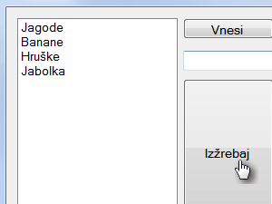 Nato dvokliknimo na prvi gumb in vnesimo kodo: ListBox1.Items.Add(TextBox1.Text) If TextBox1.Text = "" Then MsgBox("Polje ste pustili prazno! Vnesite vsaj eno vrednost.") TextBox1.Text = "" Ta koda vam bo ob kliku na gumb besedilo iz textboxa premaknila v listbox in ob tem izbrisala besedilo iz le tega (textboxa). Če pa bo textbox prazen vam bo napisalo opozorilo, naj vnesemo vsaj eno vrednost. |