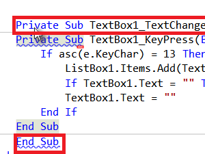 Private Sub TextBox1_KeyPress(ByVal sender As Object, ByVal e As System.Windows.Forms.KeyPressEventArgs) Handles TextBox1.KeyPress If asc(e.KeyChar) = 13 Then ListBox1.Items.Add(TextBox1.Text) If TextBox1.Text = "" Then MsgBox("Polje ste pustili prazno! Vnesite vsaj eno vrednost.") TextBox1.Text = "" End If End Sub Ob tem pa moramo še izbrisati zgornjo in spodnjo vrstico. |