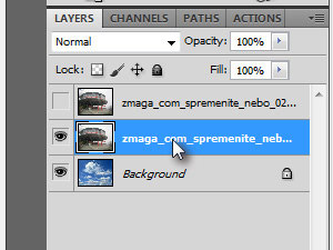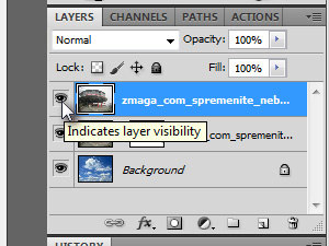 Nato pa pritisnite tipki Ctrl + J, da duplicirate layer. Zgornji layer nato skrijte tako, da kliknete na ikono z očesom (glej sliko). |