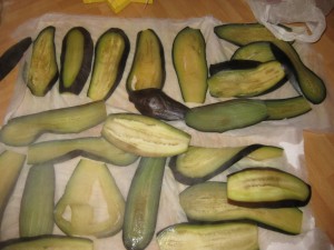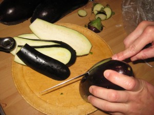 Nato pripravite jajčevce, jih umijte in nato narežite na rezine debele približno pol centimetra.