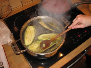 Pripravite lonec z vodo in ga postavite na štedilnik, nastavljen z najvišjo temperaturo ter počakajte, da voda zavre. Rezine jajčevca nato blanširamo v vreli vodi 3 minute. |