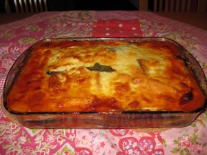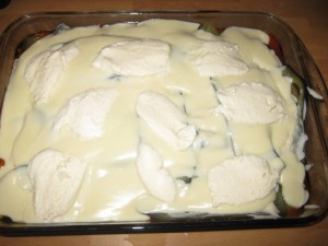 Zadnja plast naj bo iz jajčevcev, to prelijete z bešamelom ter dodate na rezine narezano mocarelo. |