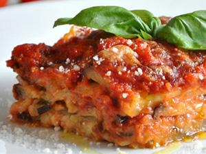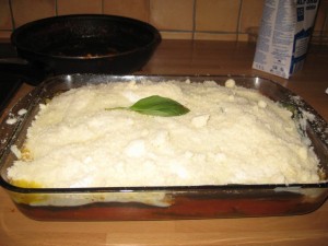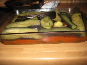 V pekač dajte žlico olja, olivnega ali katerega drugega, in razmažite po vsej površini pekača. Nato zložite rezine jajčevca v pakač, tako da prekrijete dno pekača. Prelijte z delom omake in nato spet plast jajčevcev, postopek ponavljajte dokler vam ne zmanjka sestavin. |
