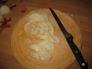 Vzemite čebulo in jo z nožem narežite na tanke kolobarje.