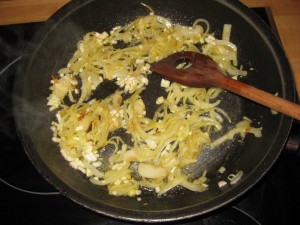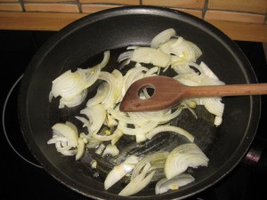 Nato pristavite ponev na štedilnik z nastavljeno srednje visoko temperaturo in jo na olivnem olju začnite pripravljeno čebulo počasi pražiti toliko, da postekleni. Posolite vse skupaj. |