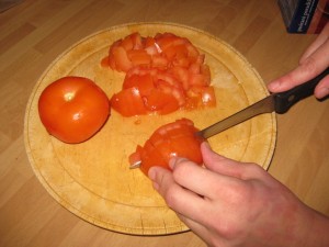 Vzemnite dva paradižnika in ju narežite na koščke. |