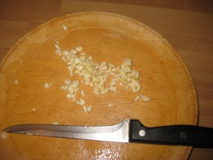 Ko čebula postekleni, dodajte česen in paradižnk ter premešajte. |