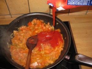 Nato dodajte še paradižnikovo pulpo in vse skupaj ponovno dobro premešajte. Kuhajte 10 minut. |