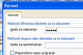 V polje Geslo za odpiranje vpišite geslo, s katerim bo edino mogoče odpirati dokument. Če želite, da se dokument lahko odpira brez urejanja, izberite polje Geslo za spreminjanje. |