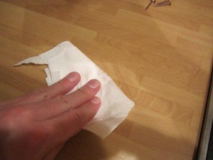 Lahko uporabite tudi navadno krpo, če papirnate brisače nimate. Lahko tudi s straniščnim papirjem, samo, da se lesena podlaga navlaži. Ne sme pa biti mokra.