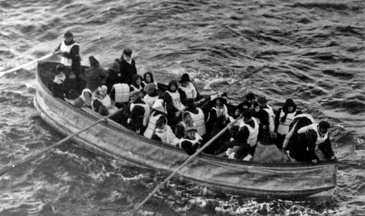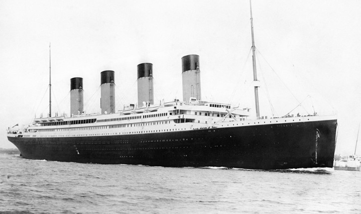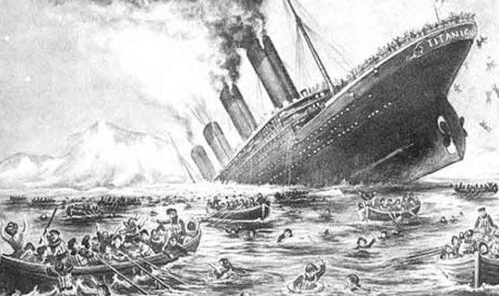 14. aprila ob 23:40 je bila žal prepozno opažena ledena gora, ki se ji Titanik ni mogel izogniti in po trčenju je imel šest lukenj, ki niso bile večje od 1,2 kvadratnega metra. Zanimivo je dejstvo, da so se luknje zaradi pritiska povečale, za kar naj bi krivdo pripisali cenejšemu materialu. Pol ure po trku je kapitan ukazal evakuacijo in začel iskati pomoč drugih ladij. Evakuacijo so mnogi potniki razumeli kot šalo, saj so bili mnenja, da se ladja ne more potopiti. Dobro znano je, da je med evakuacijo skoraj do konca tragedije igral orkester, z namenom, da bi pomiril potnike.