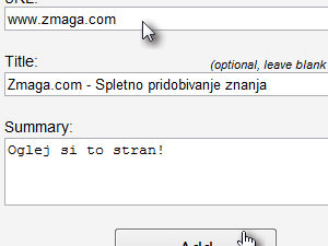 V mojem primeru je to www.zmaga.com (obvezno). Nato pod Title vpišete poljuben naslov shranjene vsebine (ni obvezno, lahko pustite prazno). V mojem primeru je to Zmaga.com - Spletno pridobivanje znanja. Zadnja točka pa je kratek, poljuben povzetek te strani (tudi neobvezno, lahko pustite prazno). Nato kliknete na gumb Add in s tem shranite željeno spletno stran.