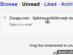Zdaj, ko se nahajate na drugi strani, pa enostavno kliknite na zaznamek oz. gumb Read Later, ki smo ga maloprej dodali v vrstico z zaznamki.
