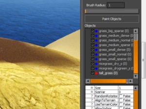V spodnjih nastavitvah se malo poigrajte. Za tiste ki ne znate dobro angleško, vam bom nekaj glavnih funkcij prevedel: Size (velikost), AlignToTerrain (poravnaj s terenom), RandomRotation (naključno obračanje predmeta), CastShadow (dodajte predmetu senco). Sedaj ko imate takšne nastavitve, kot želite, lahko začnete barvati, s klikom na gumb Paint Objects. |