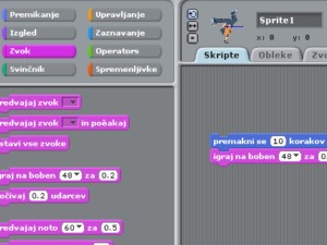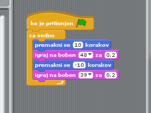 Pri drugem premakni se nastavite vrednost na -10 (s tem se bo premikal v drugo smer). Spremenite lahko tudi bobne, tako kot je prikazano na sliki. Pri upravljanu še poiščite za vedno, kar pomeni, da se bo dejanjeponavljalo, ter ko je pritisnjen (ob pritisku na zastavico se animacija začne). Končni rezultat mora biti enak, kot je prikazan na sliki. |