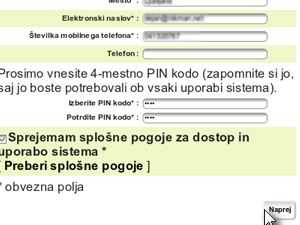 ![]() Sedaj vpišite svoje osebne podatke, e-poštni naslov in PIN kodo, s katero se boste prijavljali do storitve. |