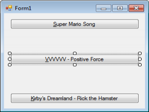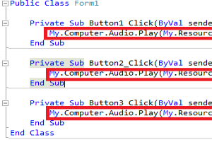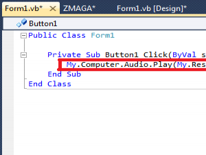Kliknemo na zgornji zavihek Form1.vb [Design] in dvokliknemo na prvi gumb (Button1). Tja skopiramo naslednjo kodo: My.Computer.Audio.Play(My.Resources."ime-datoteke1", AudioPlayMode.BackgroundLoop) Ali drugače: Koda bo predvajala audio datoteko z Vašega računalnika (Iz mojih sredstev predvaja datoteko1, način predvajanja pa bo ponavljanje v ozadju) Opomba: "ime-datoteke1" zamenjajte z imenom wav datoteke iz vašega računalnika, ki jo bo gumb predvajal. |