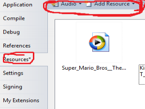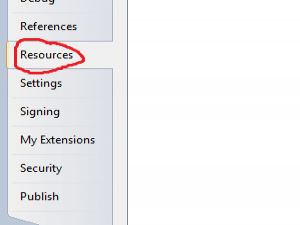 Nato odpremo lastnosti projekta (Properties) in izberemo levi zavihek Resources.